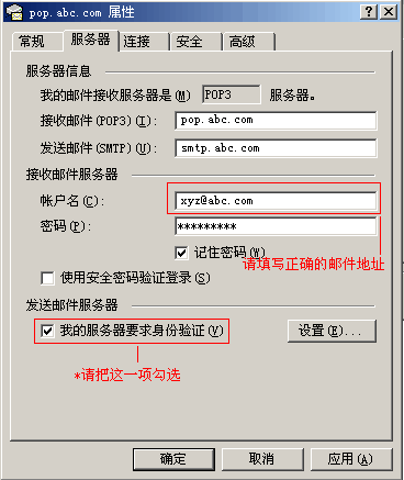 请点击服务器选项,填写正确的邮件地址,把“我的服务器要求身份验证”这一项选上。